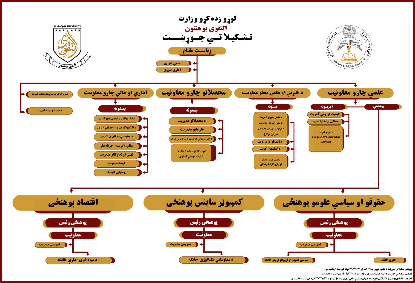 The organizational structure of Al-Taqwa Institute of Higher Education is arranged according to the laws and regulations of the Ministry of Higher Education. The Chancellor of the institution is at the top of the organizational structure, while Vice Chancellor of Academic affairs, Vice Chancellor Administrative and Financial Affairs, Vice Chancellor Students of Affairs, faculty of Law and Political Science and Economics, including many administrative and academic departments, central and faculty committees are located at the bottom. The organizational structure is applicable after the approval of the academic council of the institution.
